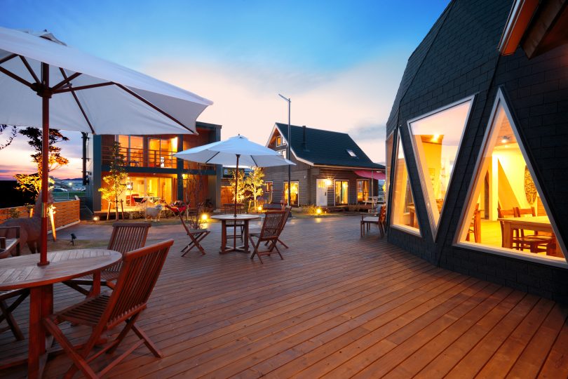 デッキで食事をしたり、木の床に寝っ転がったり。